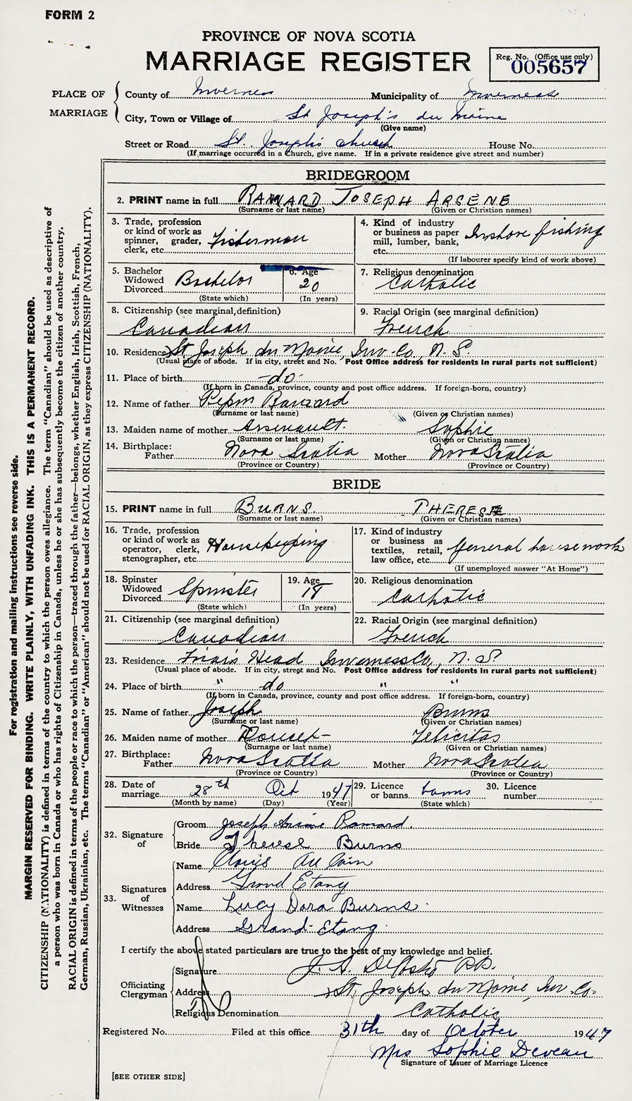 28. Date of marriage October 28 1947 29. By license or banns License 30. License number