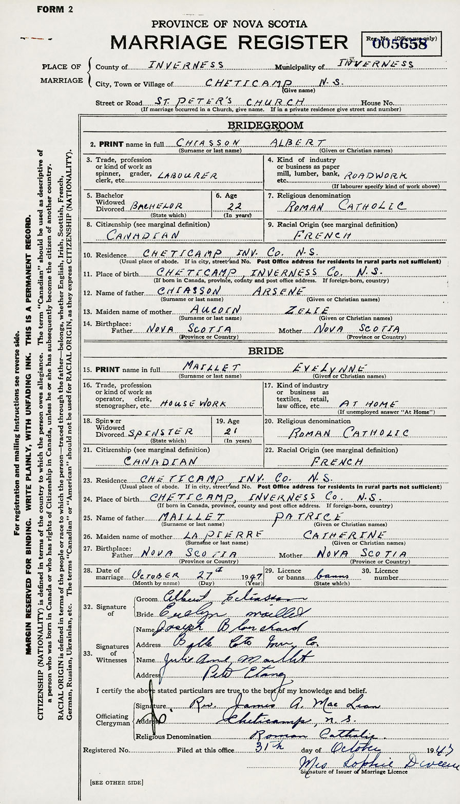 24. Place of birth Cheticamp, Inverness County, Nova Scotia