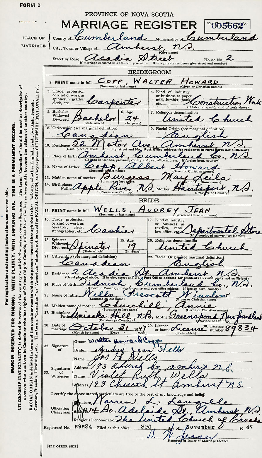 28. Date of marriage October 31 1947 29. By license or banns License 30. License number 89834