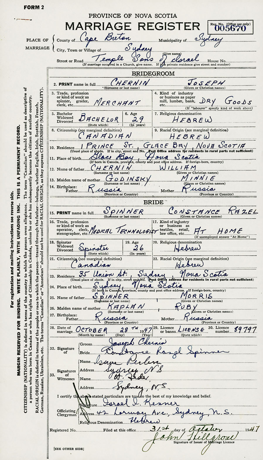 28. Date of marriage October 28 1947 29. By license or banns License 30. License number 89797