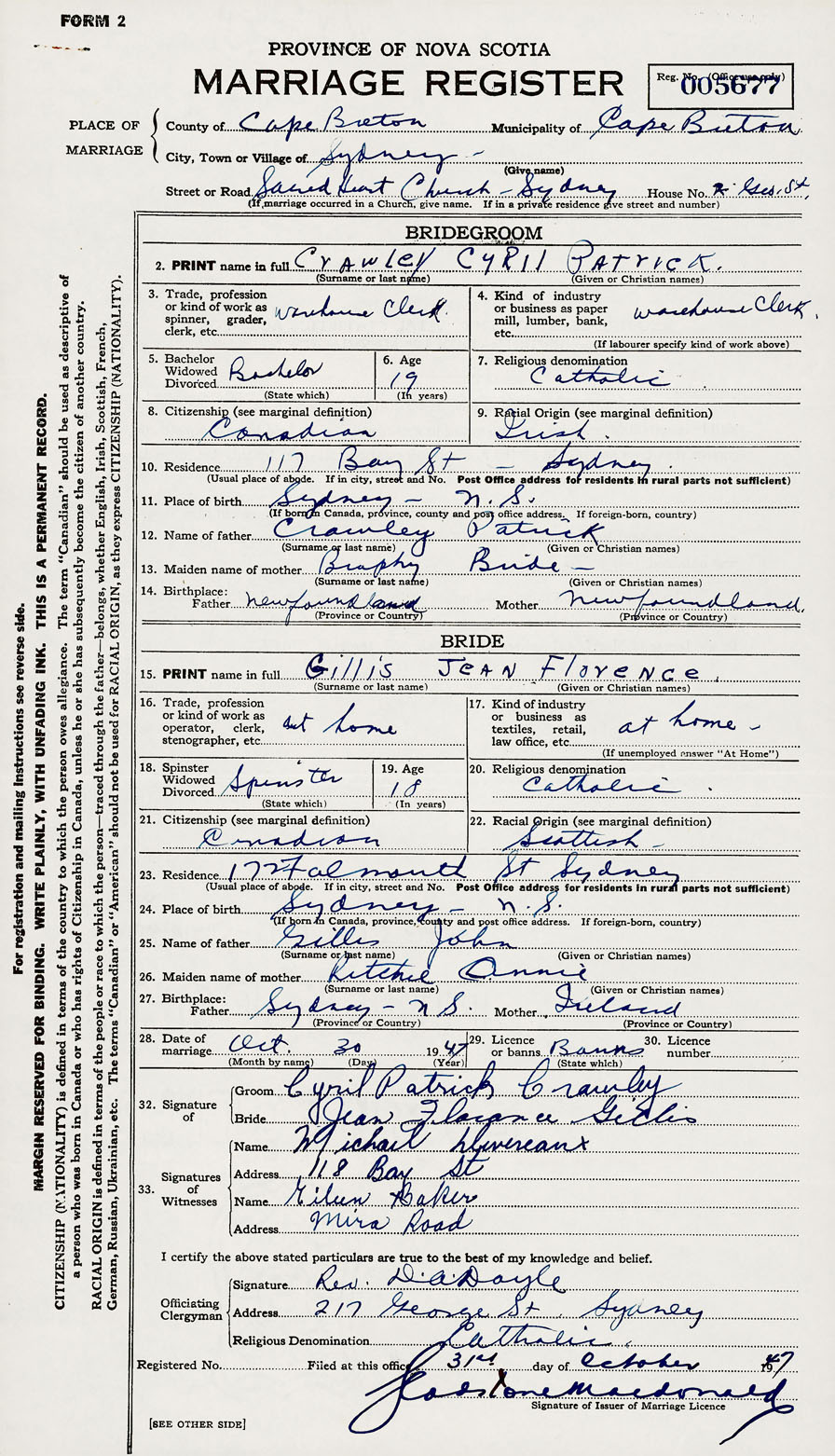 28. Date of marriage October 30 1947 29. By license or banns License 30. License number