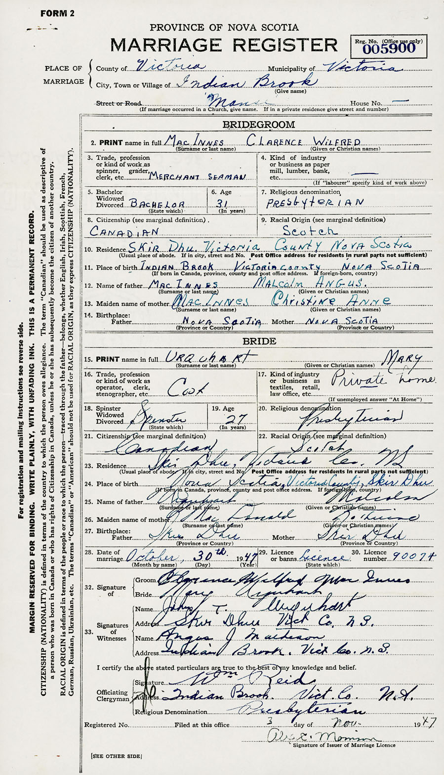 28. Date of marriage October 30 1947 29. By license or banns License 30. License number 90074
