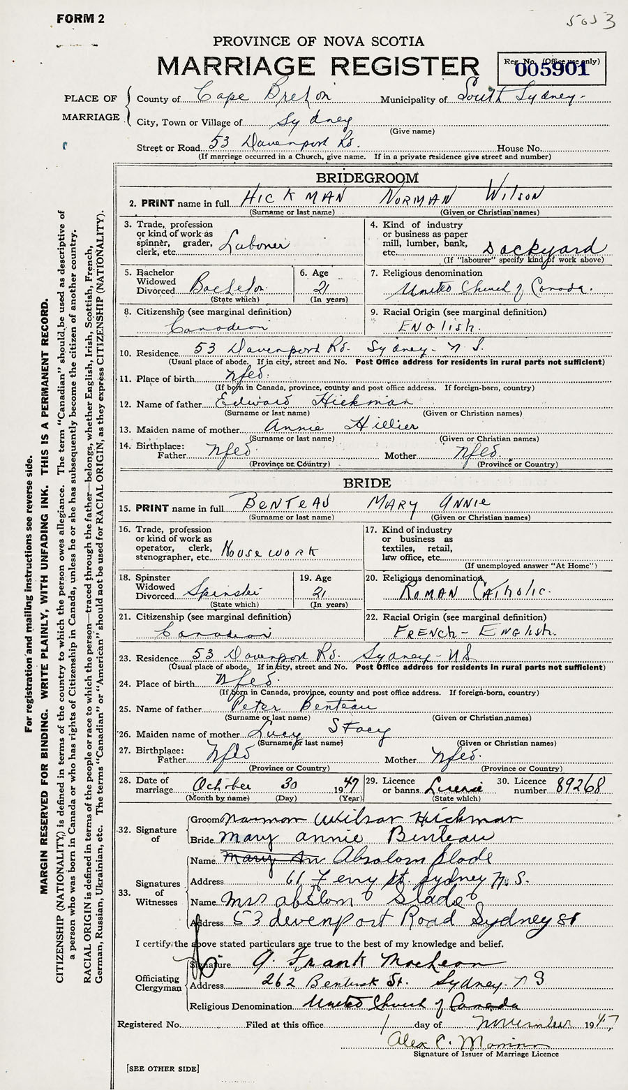 28. Date of marriage October 30 1947 29. By license or banns License 30. License number 89268