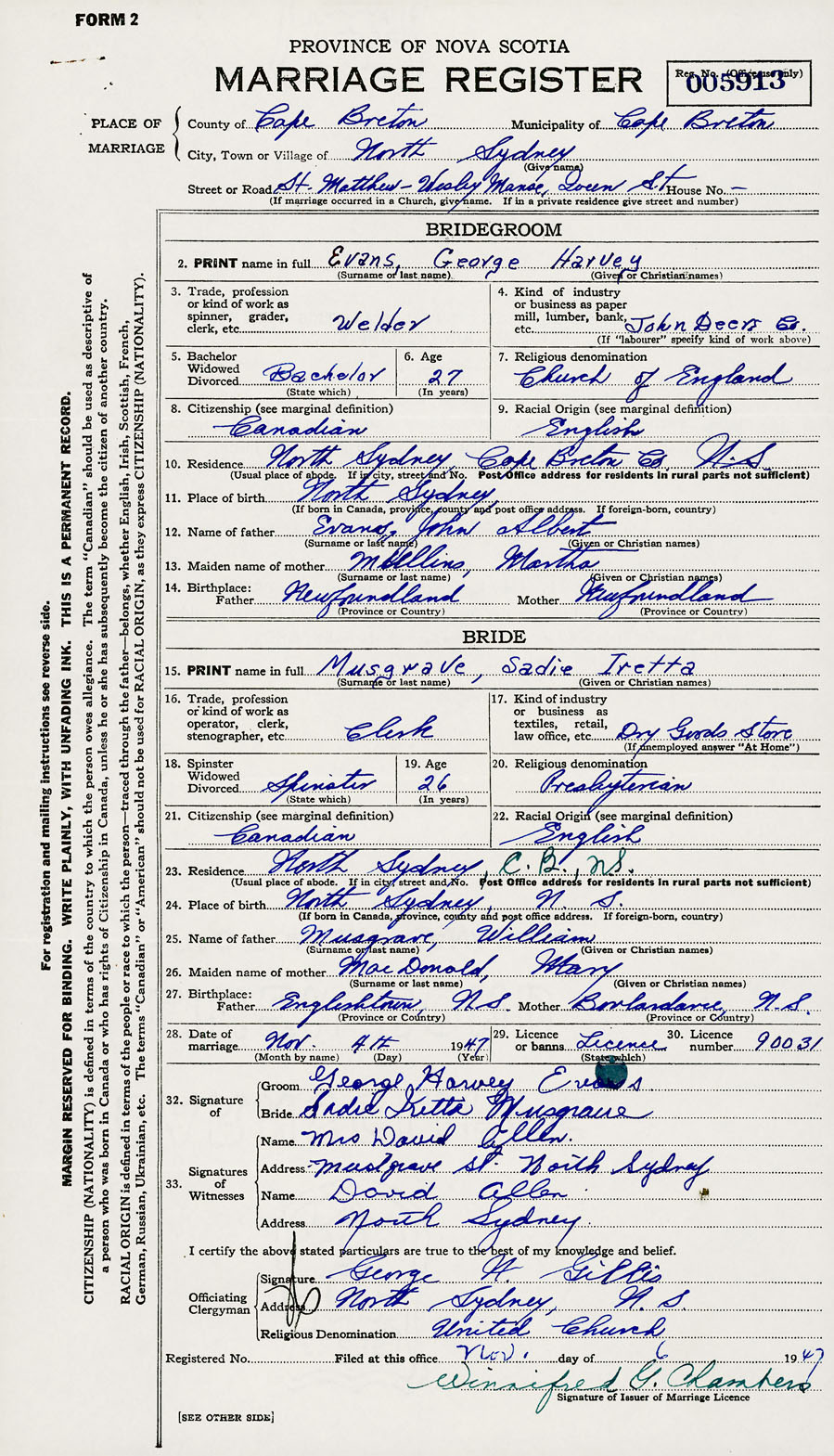 28. Date of marriage November 4 1947 29. By license or banns License 30. License number 90031