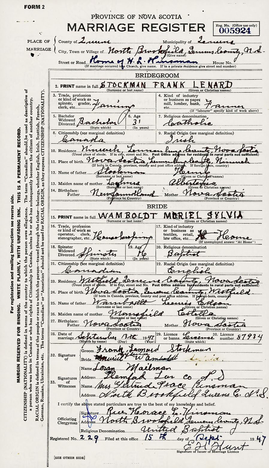 28. Date of marriage September 13 1947 29. By license or banns License 30. License number 87934