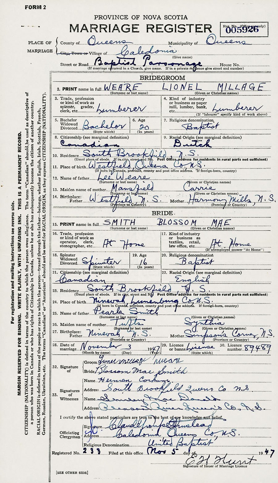 28. Date of marriage November 3 1947 29. By license or banns License 30. License number 89489