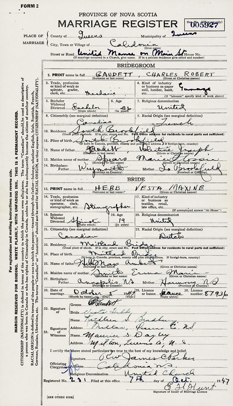 28. Date of marriage October 5 1947 29. By license or banns License 30. License number 87936