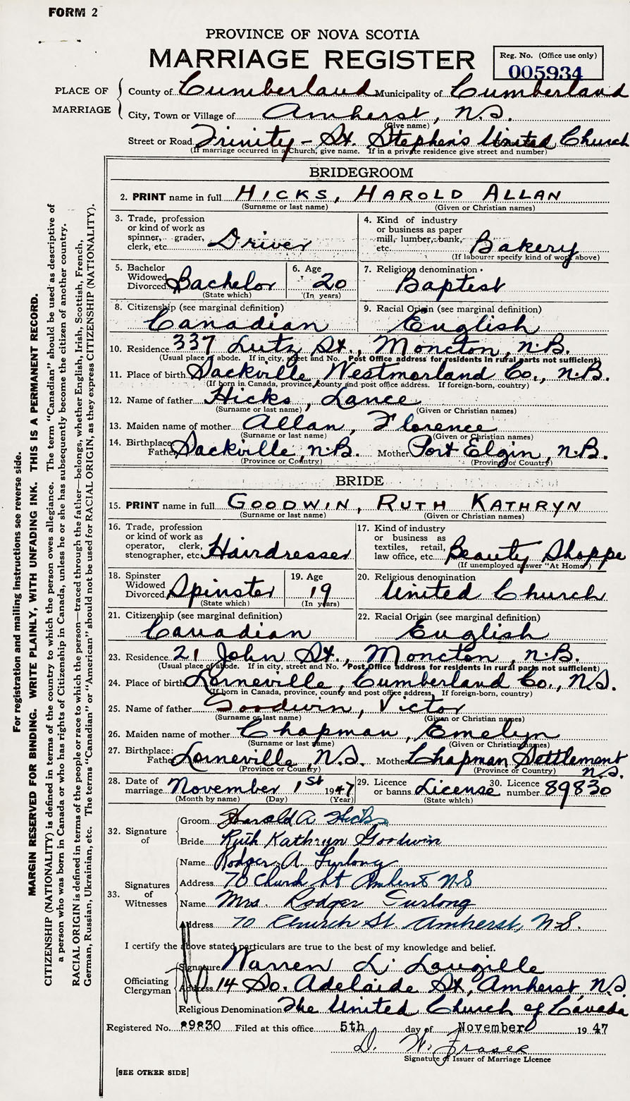 28. Date of marriage November 1 1947 29. By license or banns License 30. License number 89830