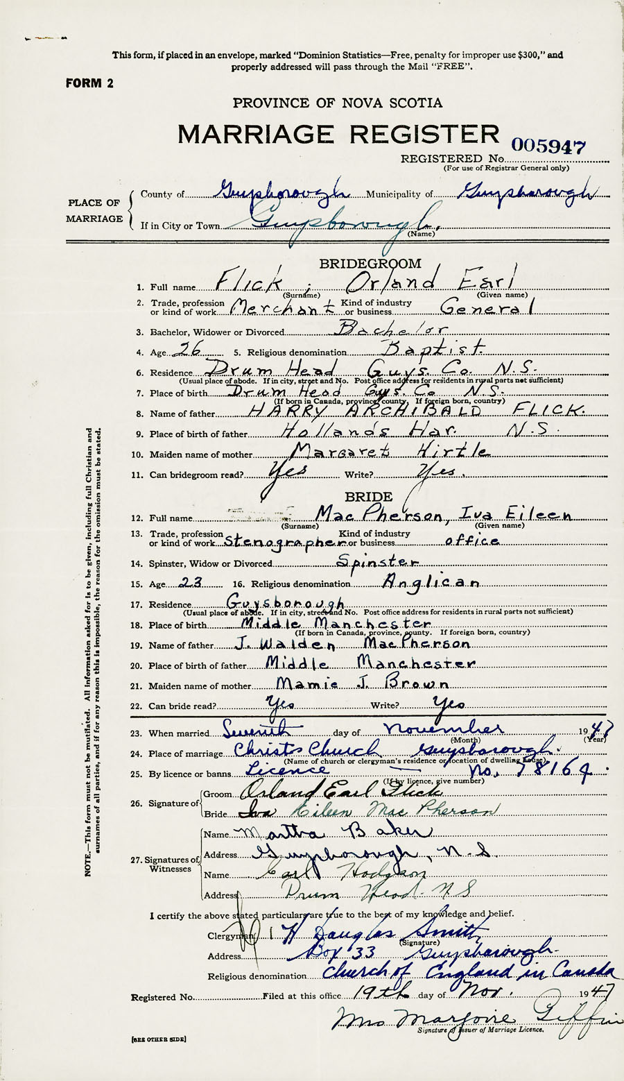 PLACE OF MARRIAGE County of Guysborough in City or Town Guysborough