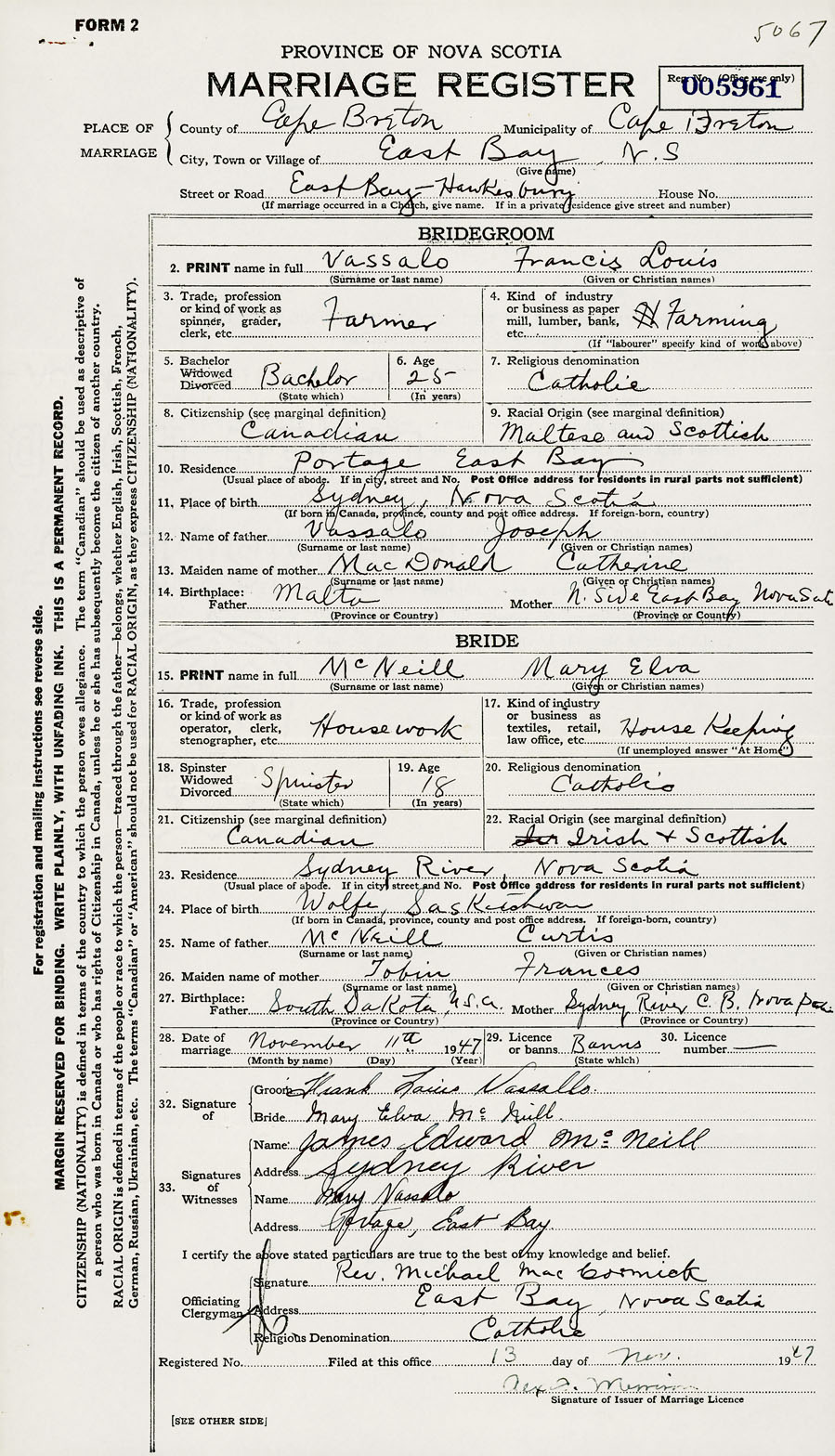 Groom Francis Louis Vassalo