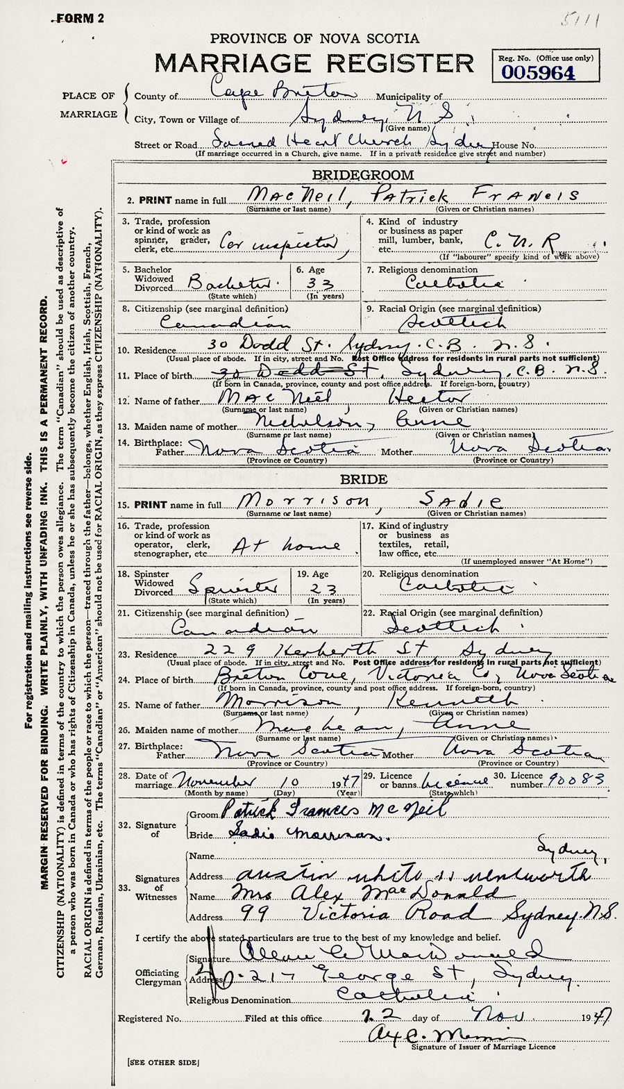 28. Date of marriage November 10 1947 29. By license or banns License 30. License number 90083