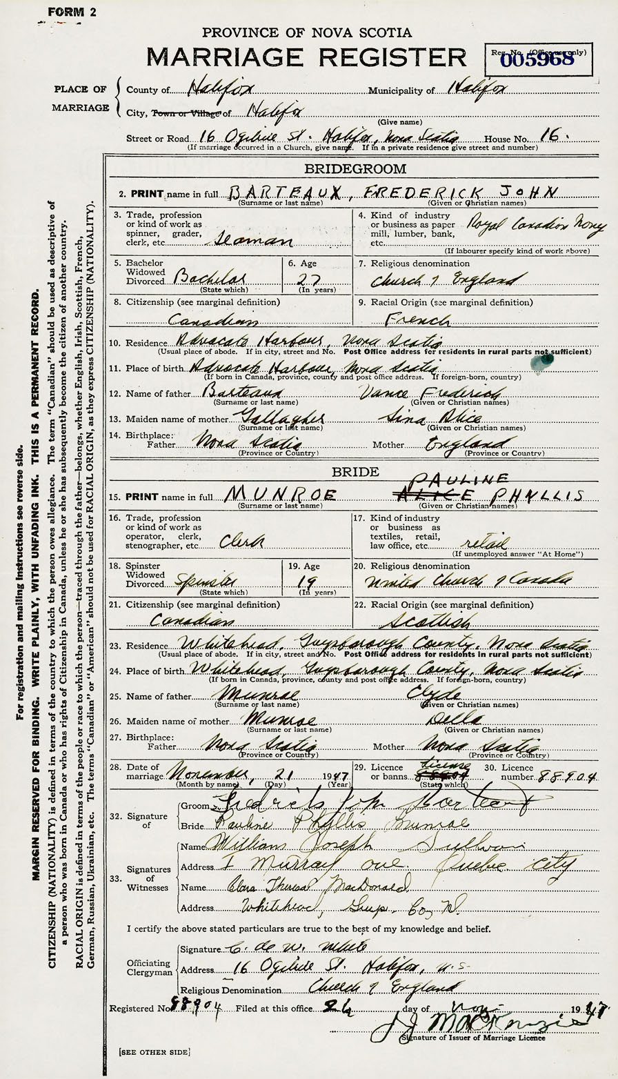 28. Date of marriage November 21 1947 29. By license or banns License 30. License number 88904