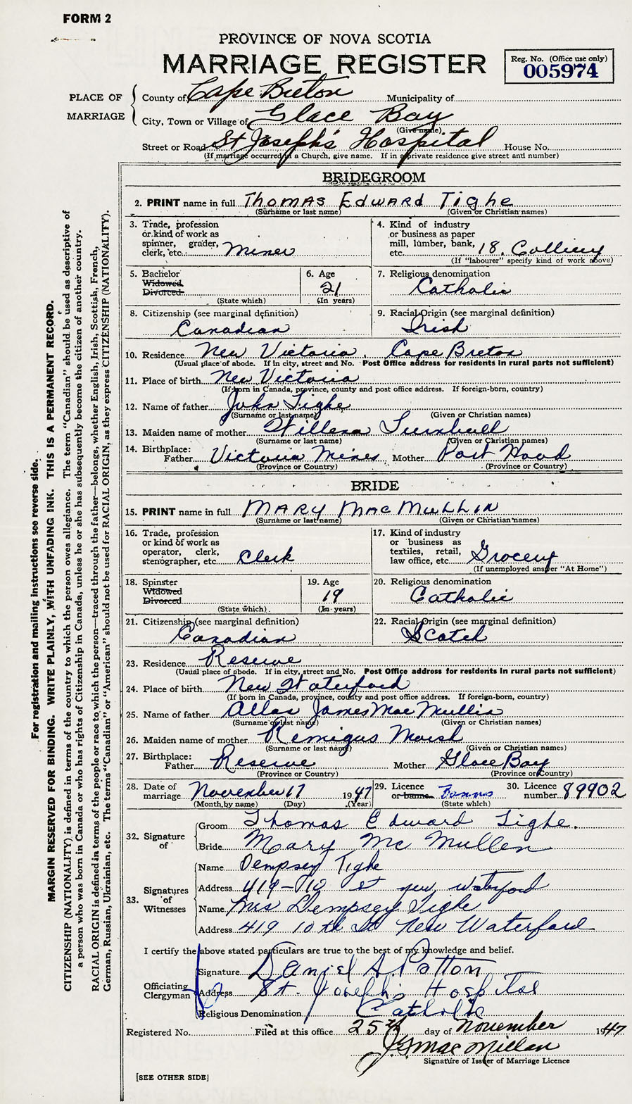 28. Date of marriage November 17 1947 29. By license or banns License 30. License number 89902