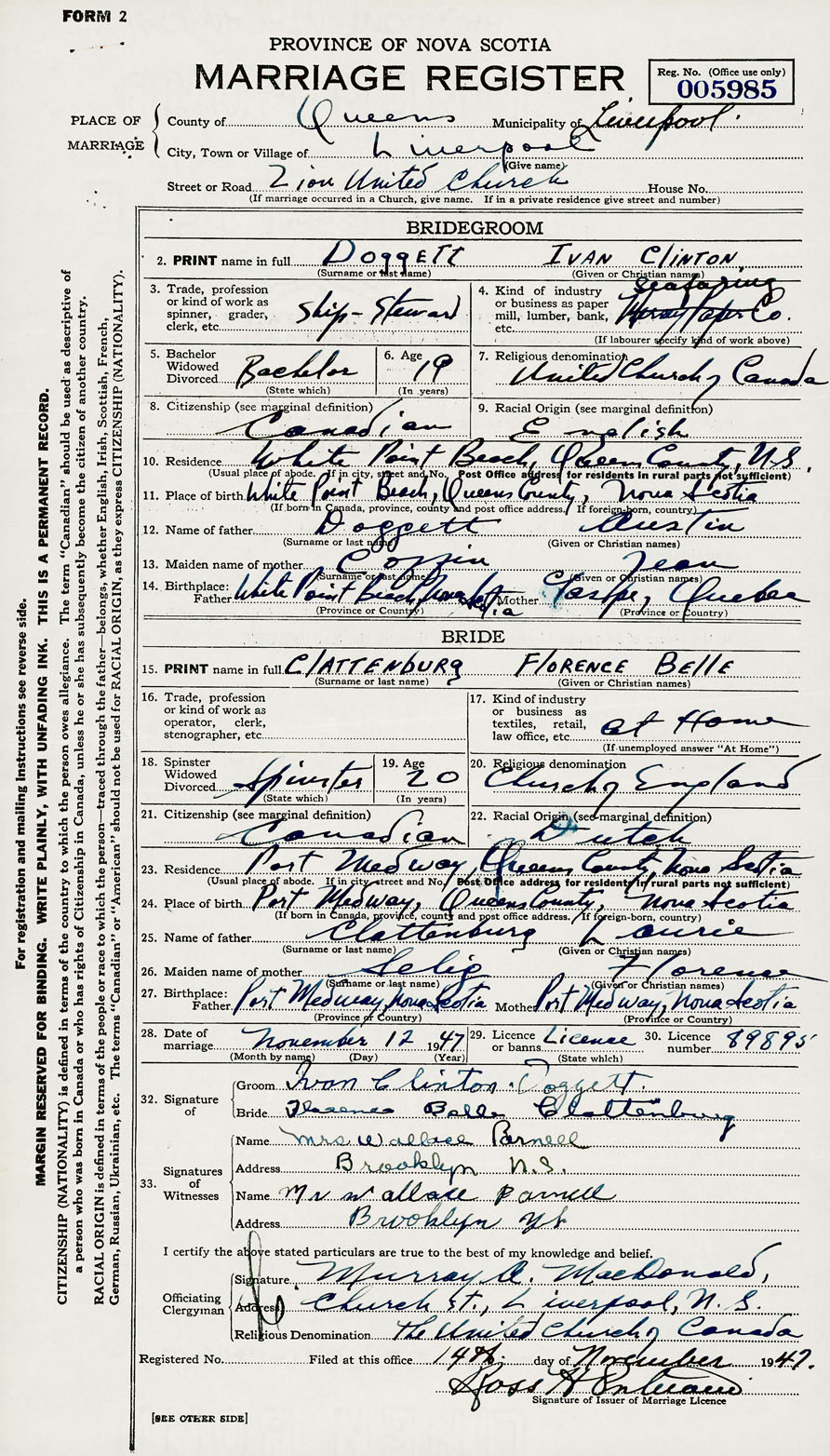 28. Date of marriage November 12 1947 29. By license or banns License 30. License number 89895