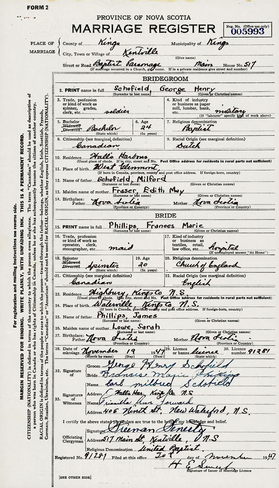 28. Date of marriage November 19 1947 29. By license or banns License 30. License number 91281