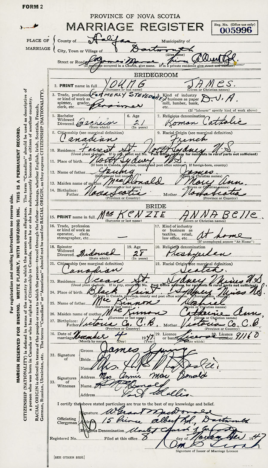 28. Date of marriage November 4 1947 29. By license or banns License 30. License number 91160