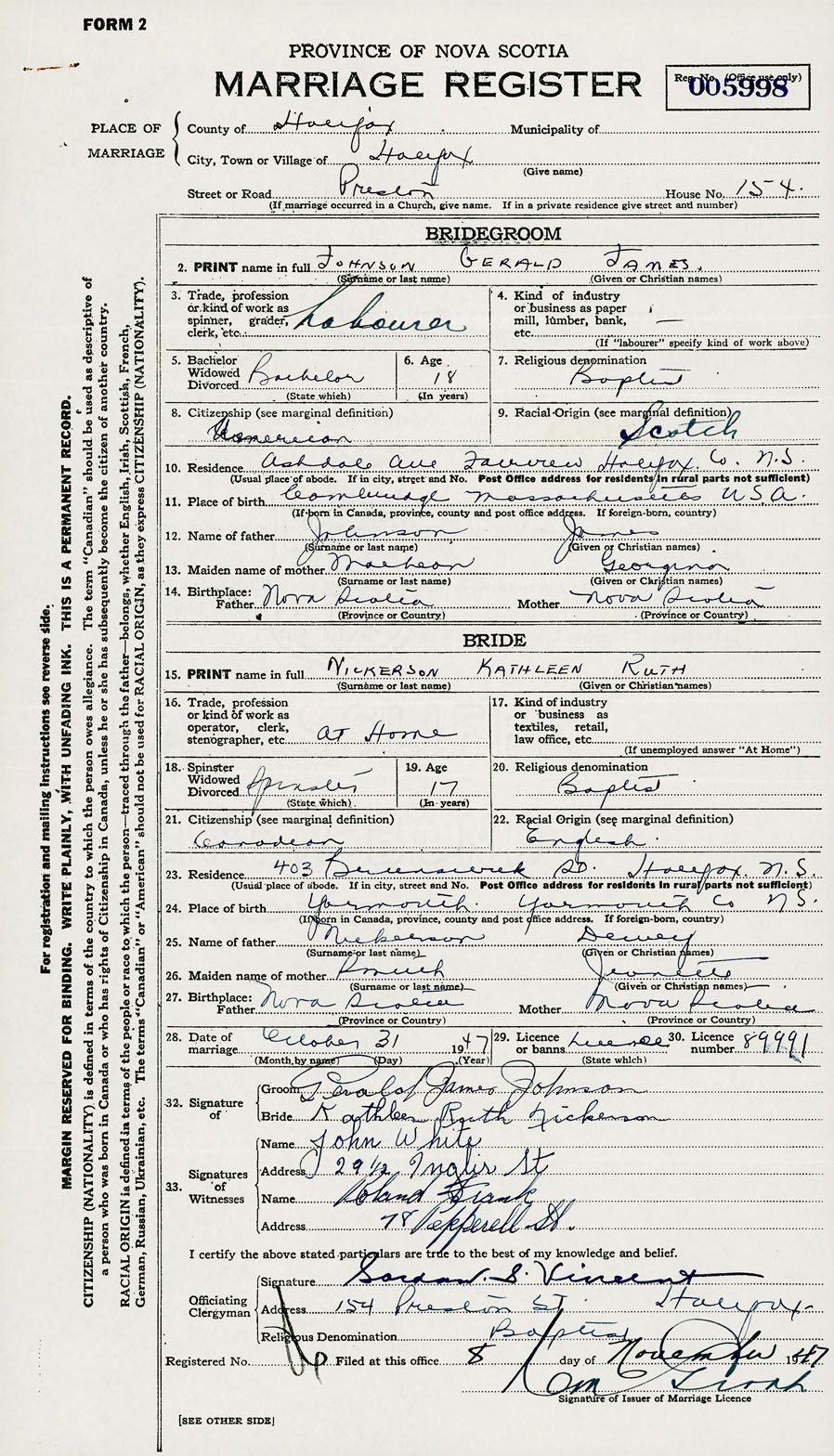 28. Date of marriage October 31 1947 29. By license or banns License 30. License number 89991