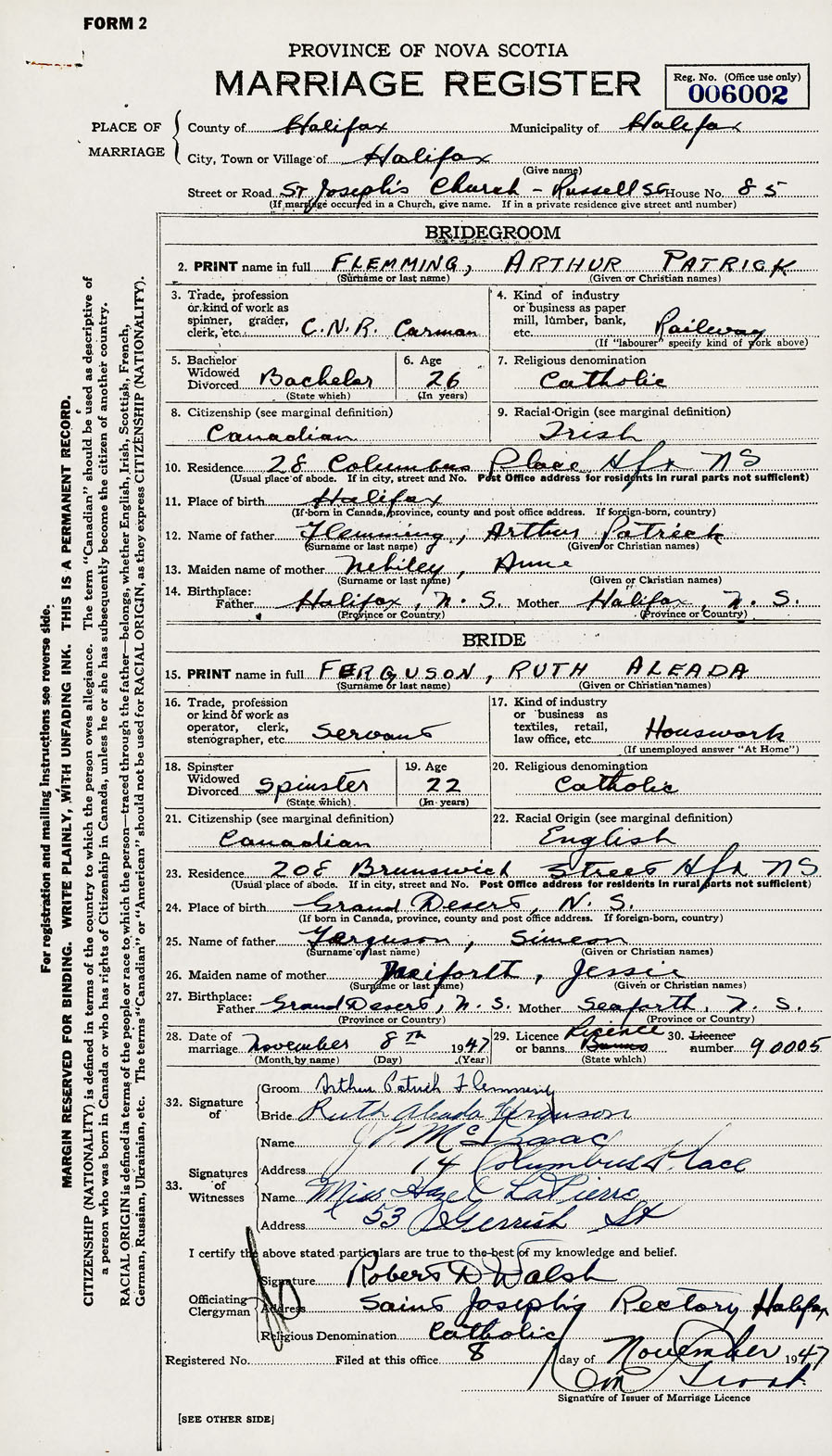 28. Date of marriage November 8 1947 29. By license or banns License 30. License number 90005