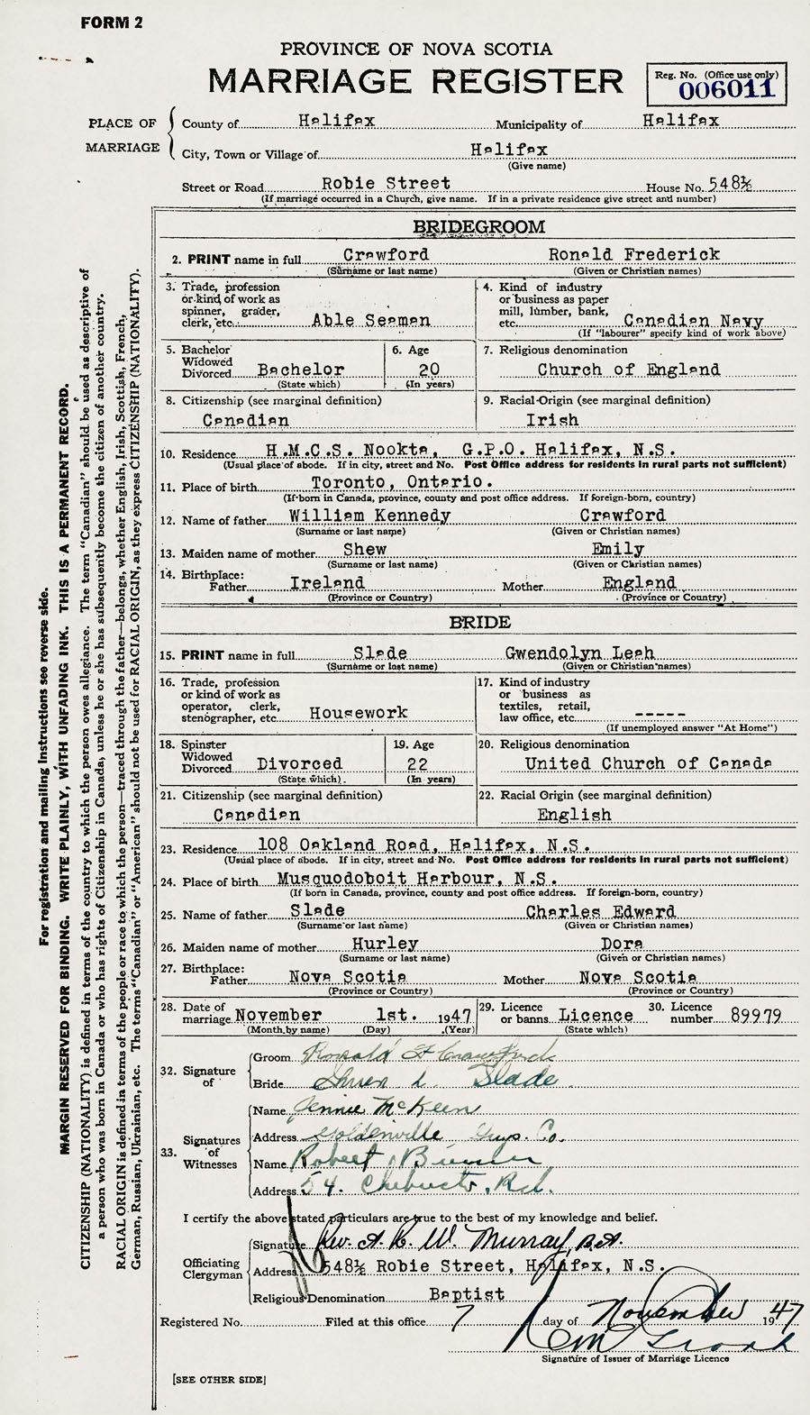 28. Date of marriage November 1 1947 29. By license or banns License 30. License number 89979