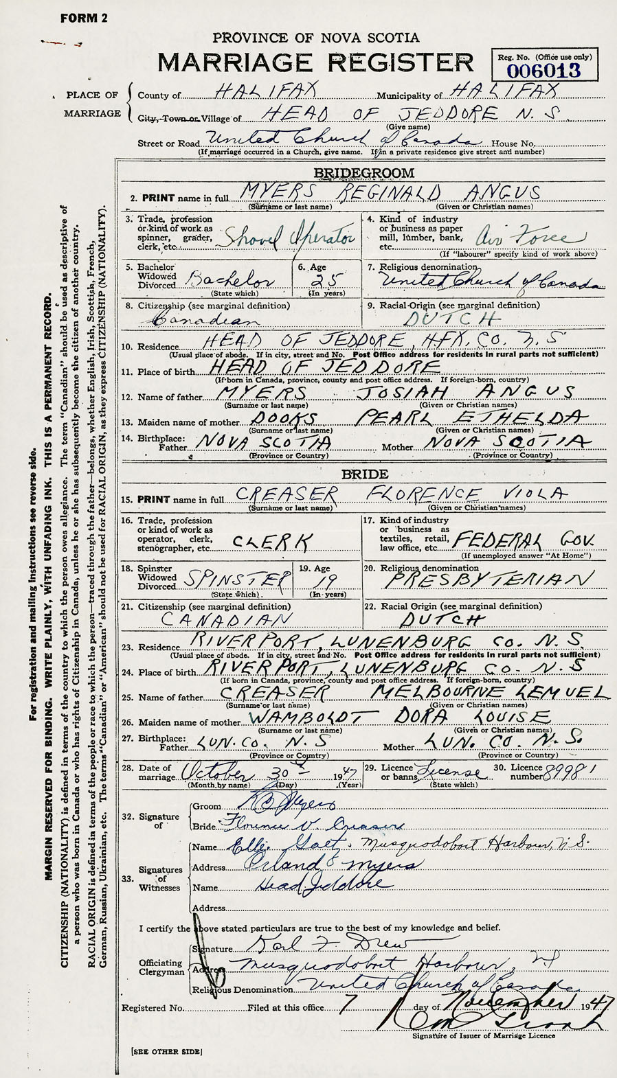 28. Date of marriage October 30 1947 29. By license or banns License 30. License number 89981
