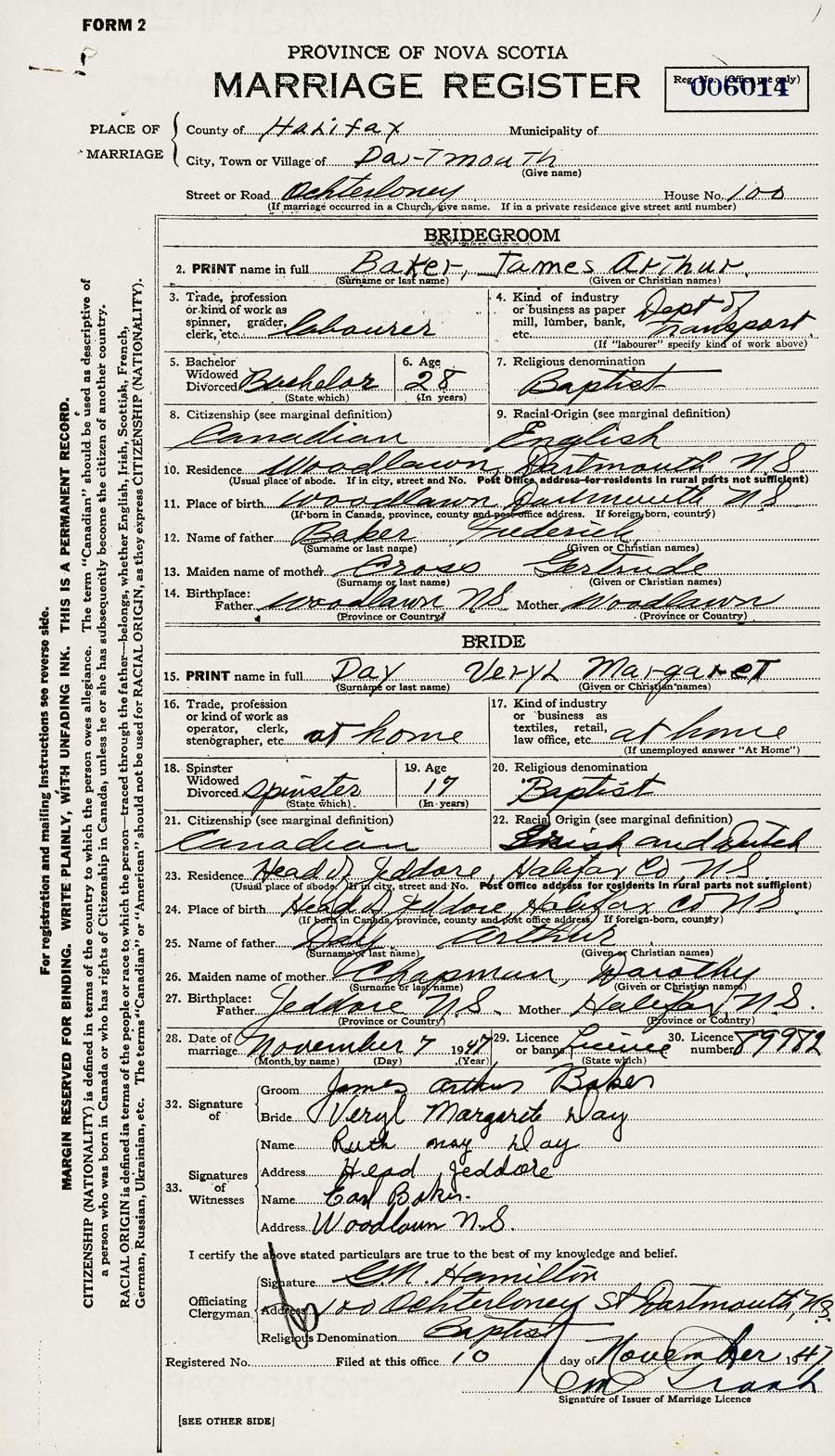28. Date of marriage November 7 1947 29. By license or banns License 30. License number 89982