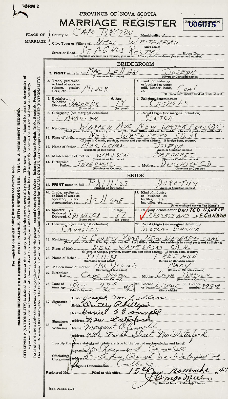 28. Date of marriage October 29 1947 29. By license or banns License 30. License number 89900