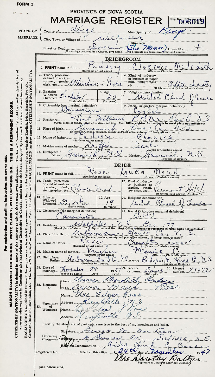 28. Date of marriage November 24 1947 29. By license or banns License 30. License number 89572