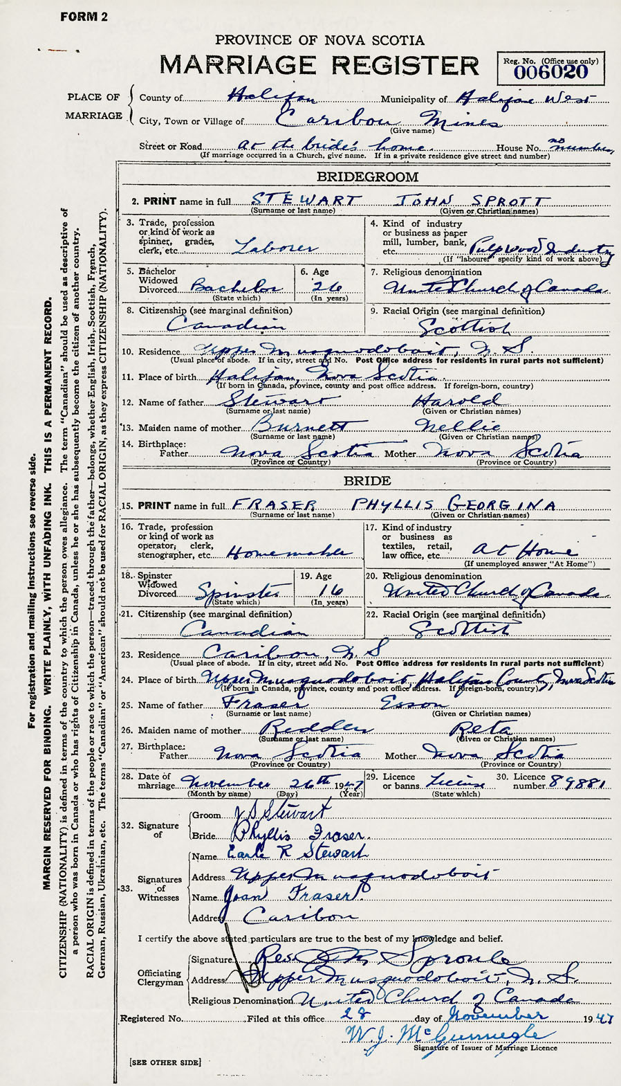 28. Date of marriage November 26 1947 29. By license or banns License 30. License number 89881