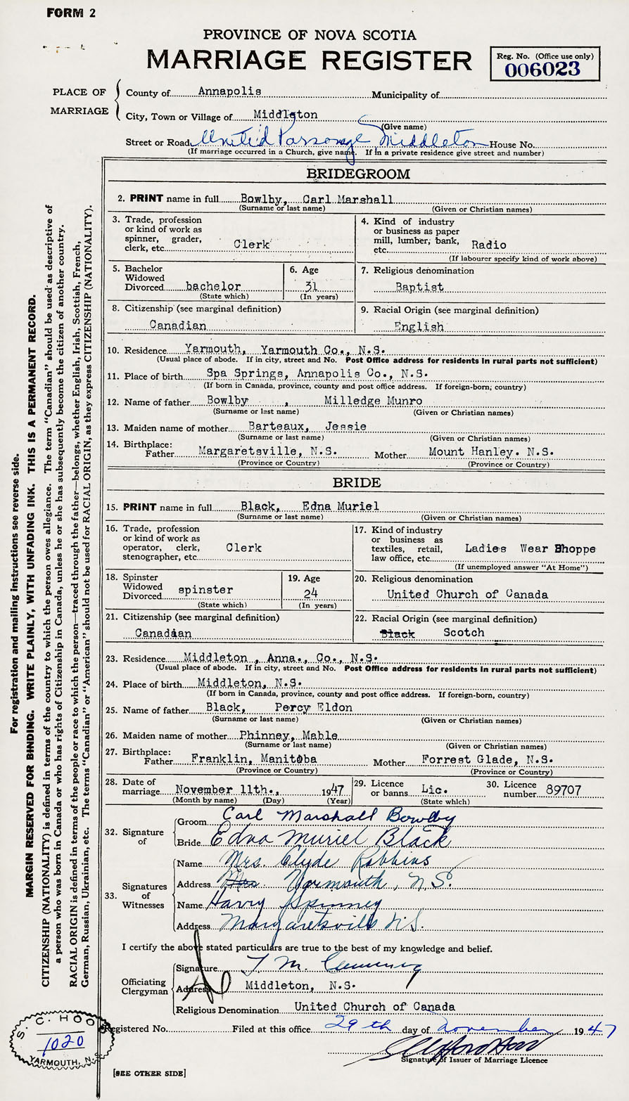 28. Date of marriage November 11 1947 29. By license or banns License 30. License number 89707