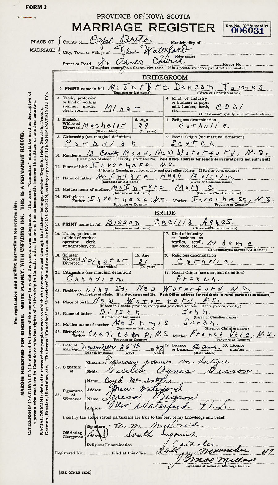 PLACE OF MARRIAGE County of Cape Breton