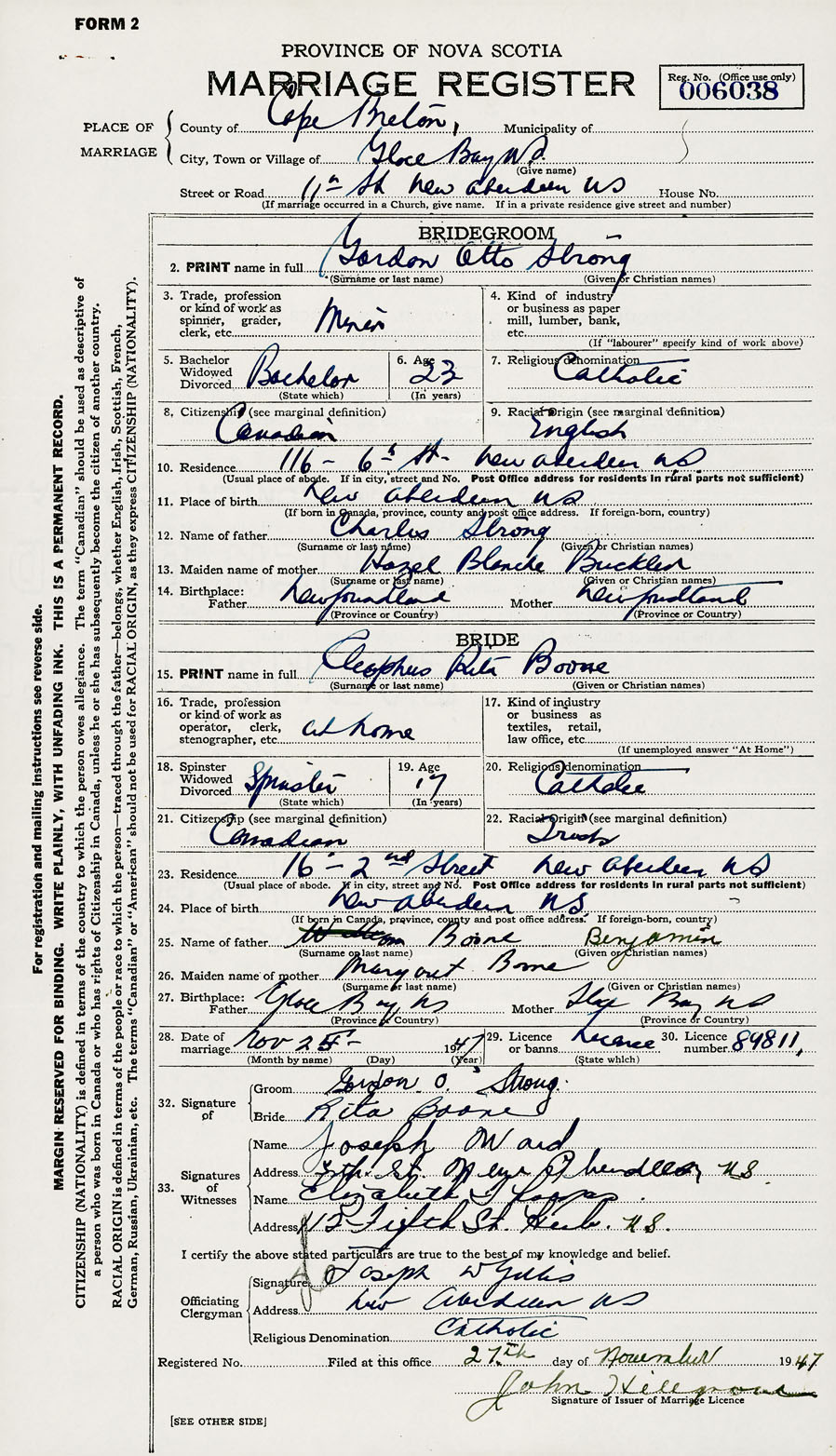 28. Date of marriage November 25 1947 29. By license or banns License 30. License number 89811