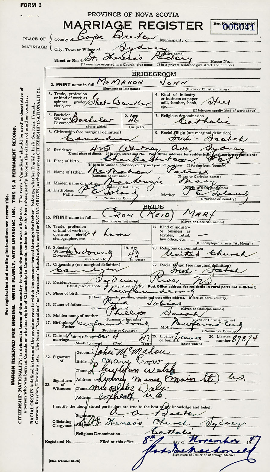 28. Date of marriage November 4 1947 29. By license or banns License 30. License number 89874