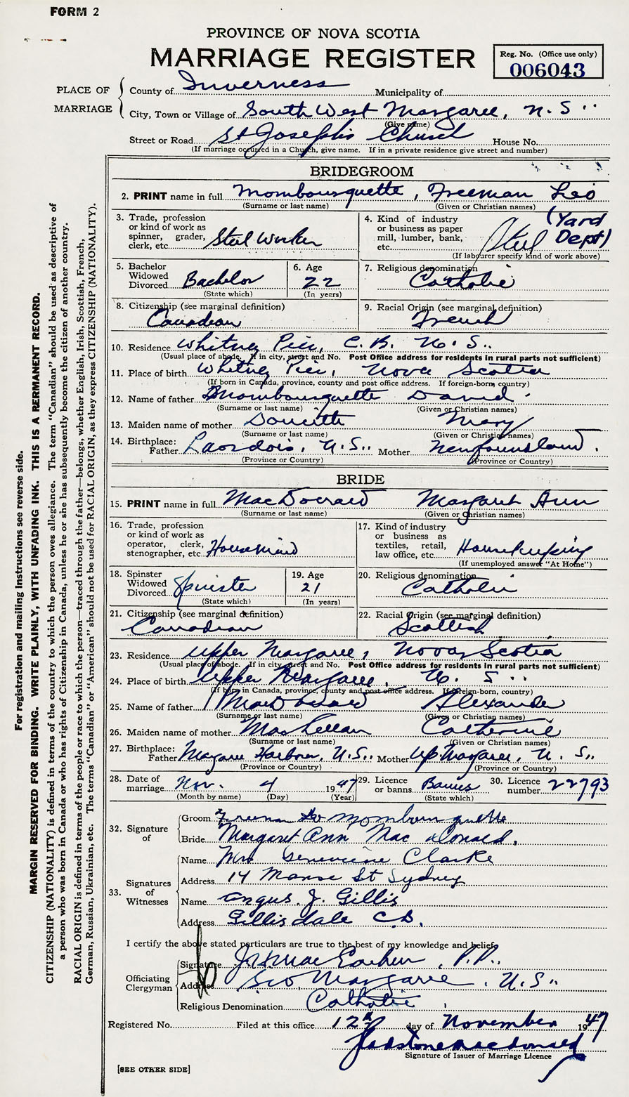 27. Birthplace Father Margaree Harbour, Nova Scotia Mother Upper Margaree. Nova Scotia