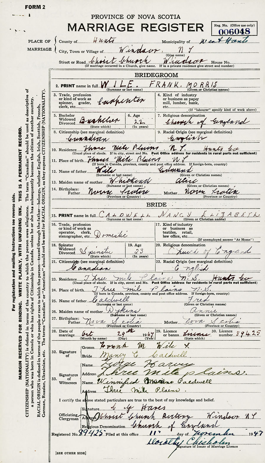 28. Date of marriage October 29 1947 29. By license or banns License 30. License number 89425