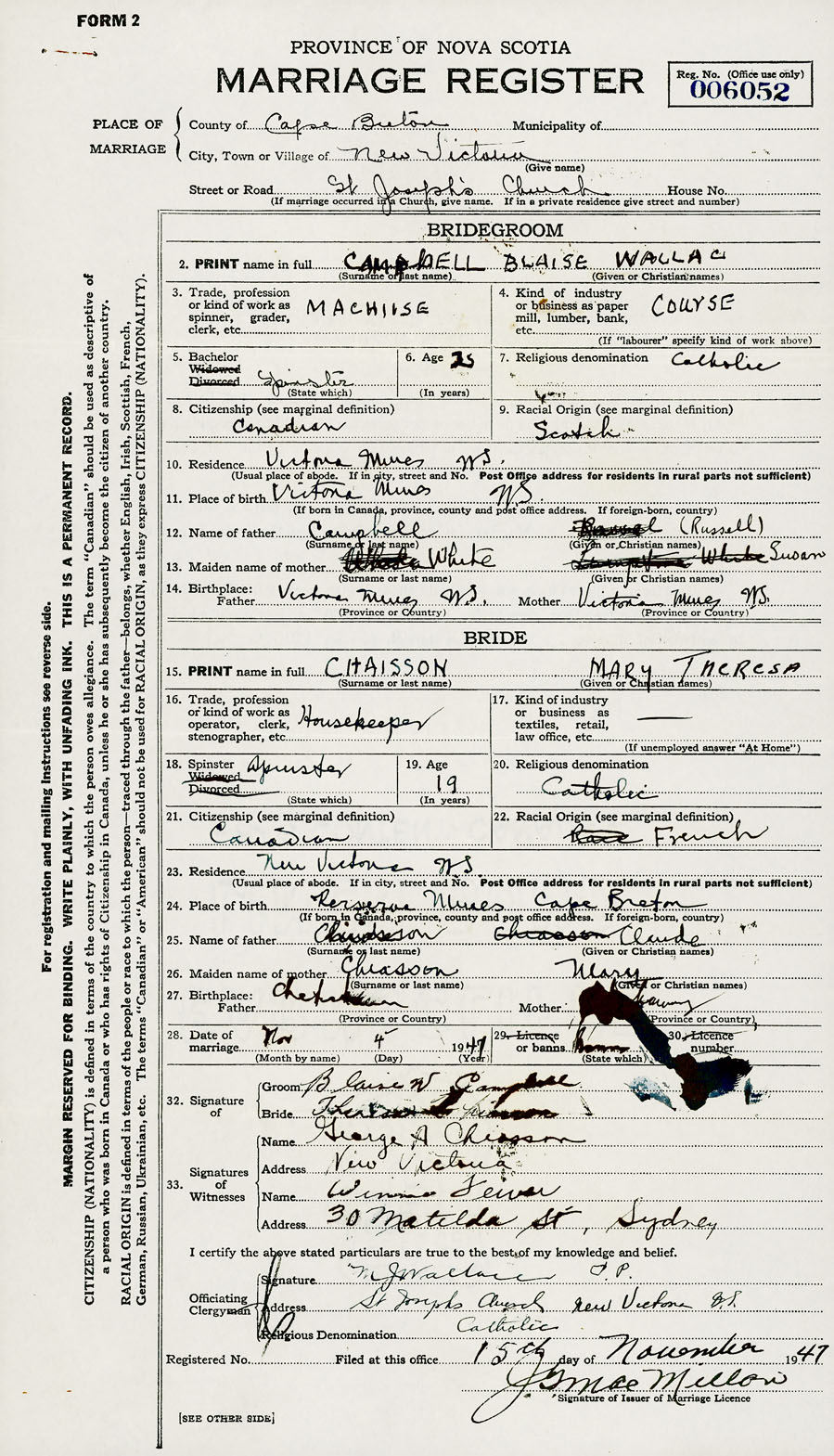 14. Birthplace Father Victoria Mines, Nova Scotia Mother Victoria Mines, Nova Scotia