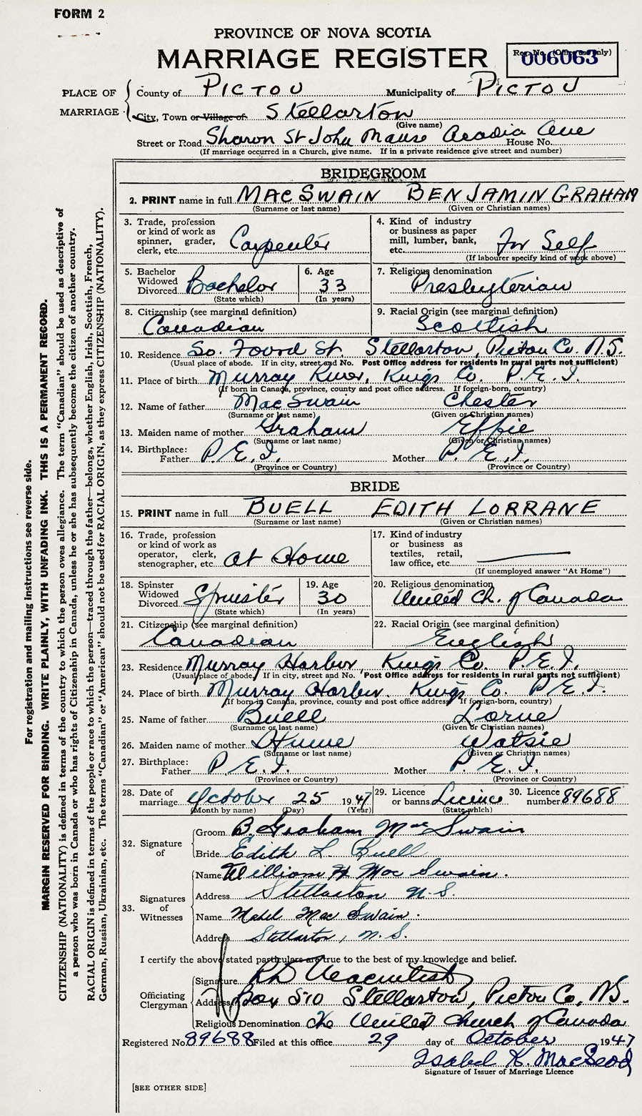 28. Date of marriage October 25 1947 29. By license or banns License 30. License number 89688
