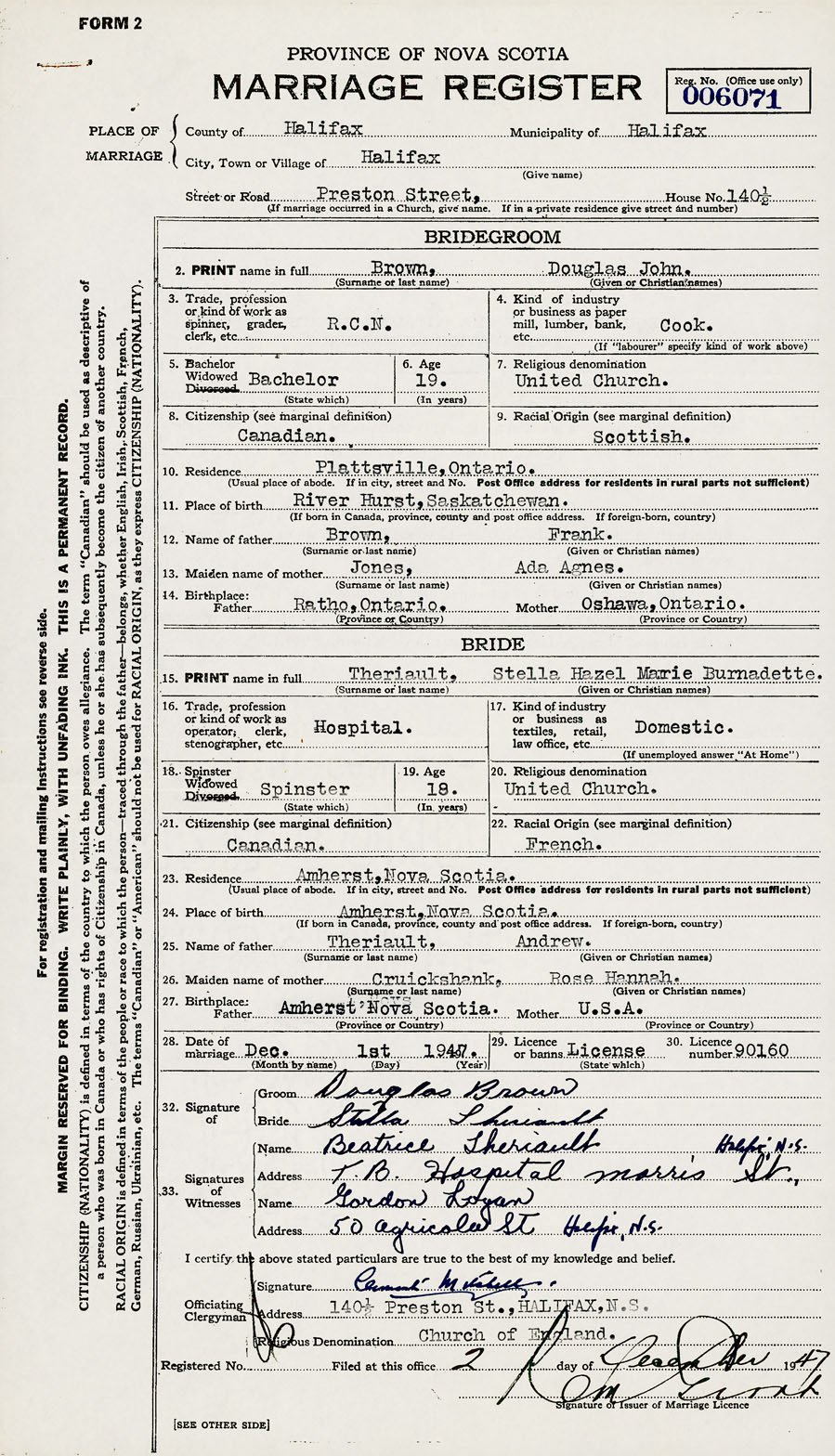 28. Date of marriage December 1 1947 29. By license or banns License 30. License number 90160
