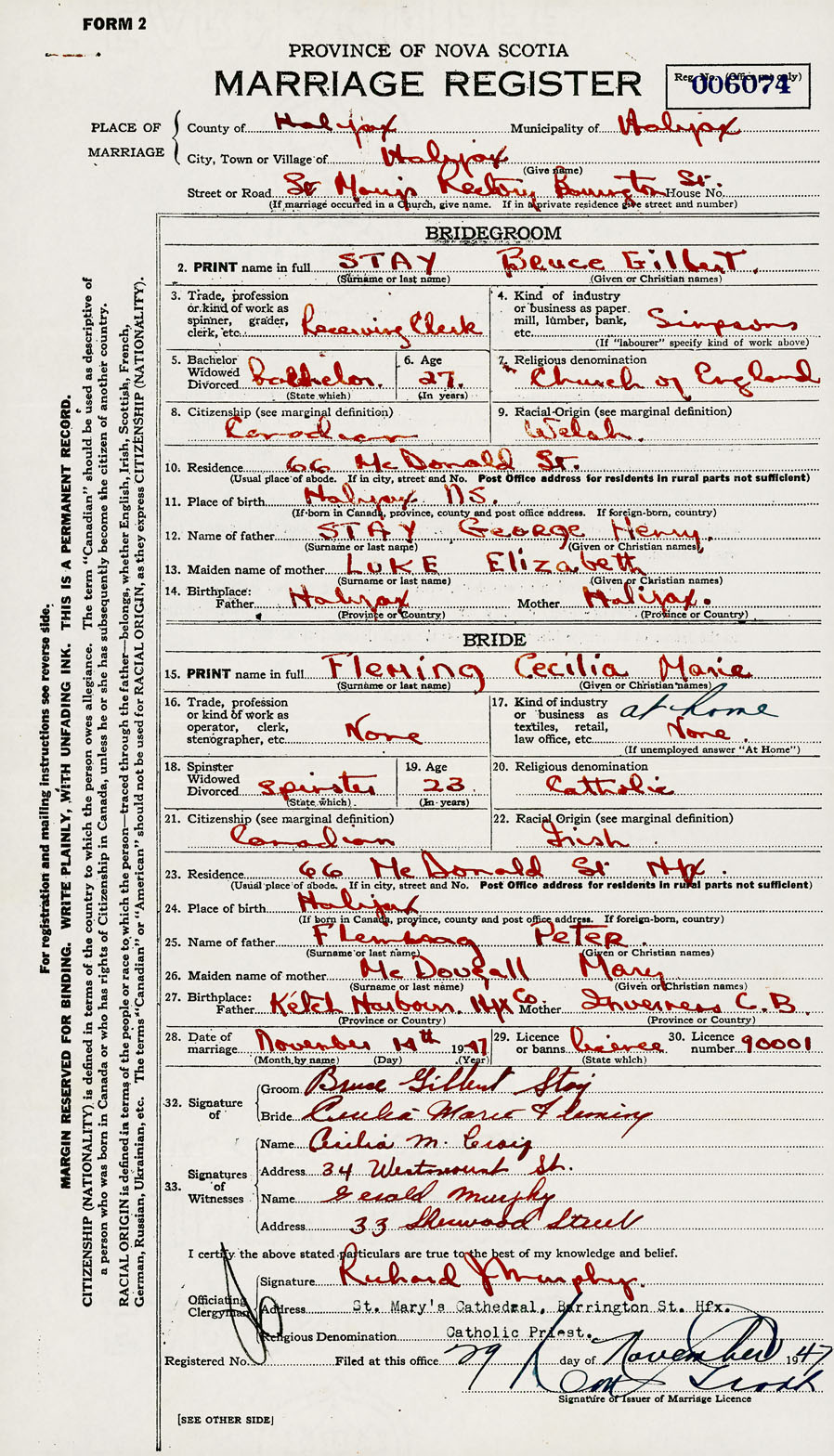 28. Date of marriage November 14 1947 29. By license or banns License 30. License number 90001