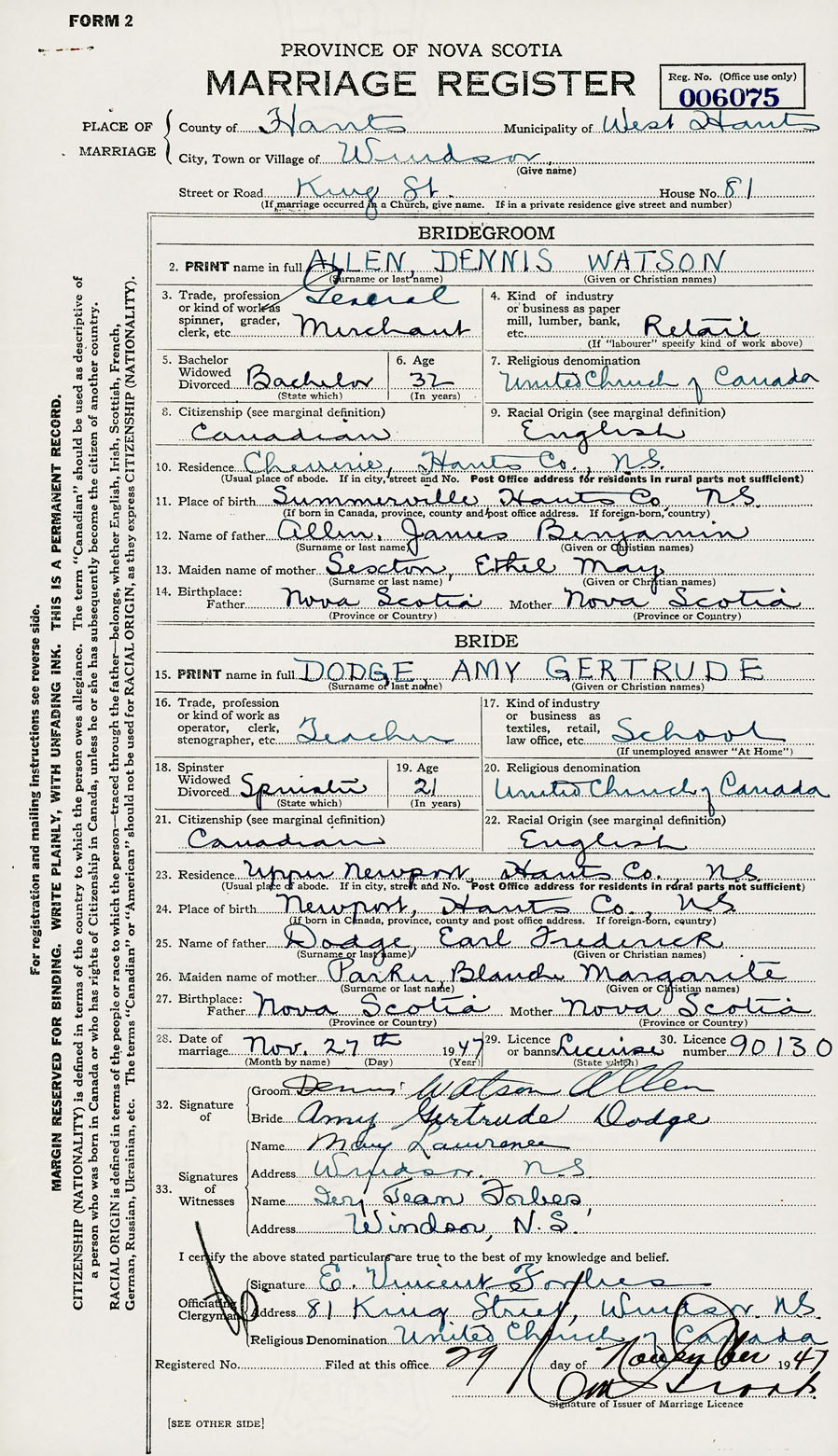 28. Date of marriage November 27 1947 29. By license or banns License 30. License number 90130
