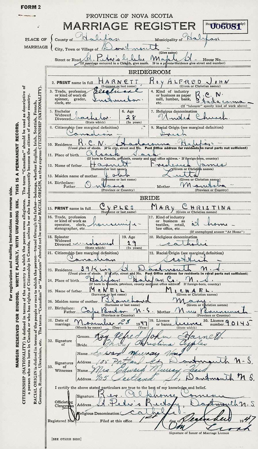 28. Date of marriage November 28 1947 29. By license or banns License 30. License number 90145