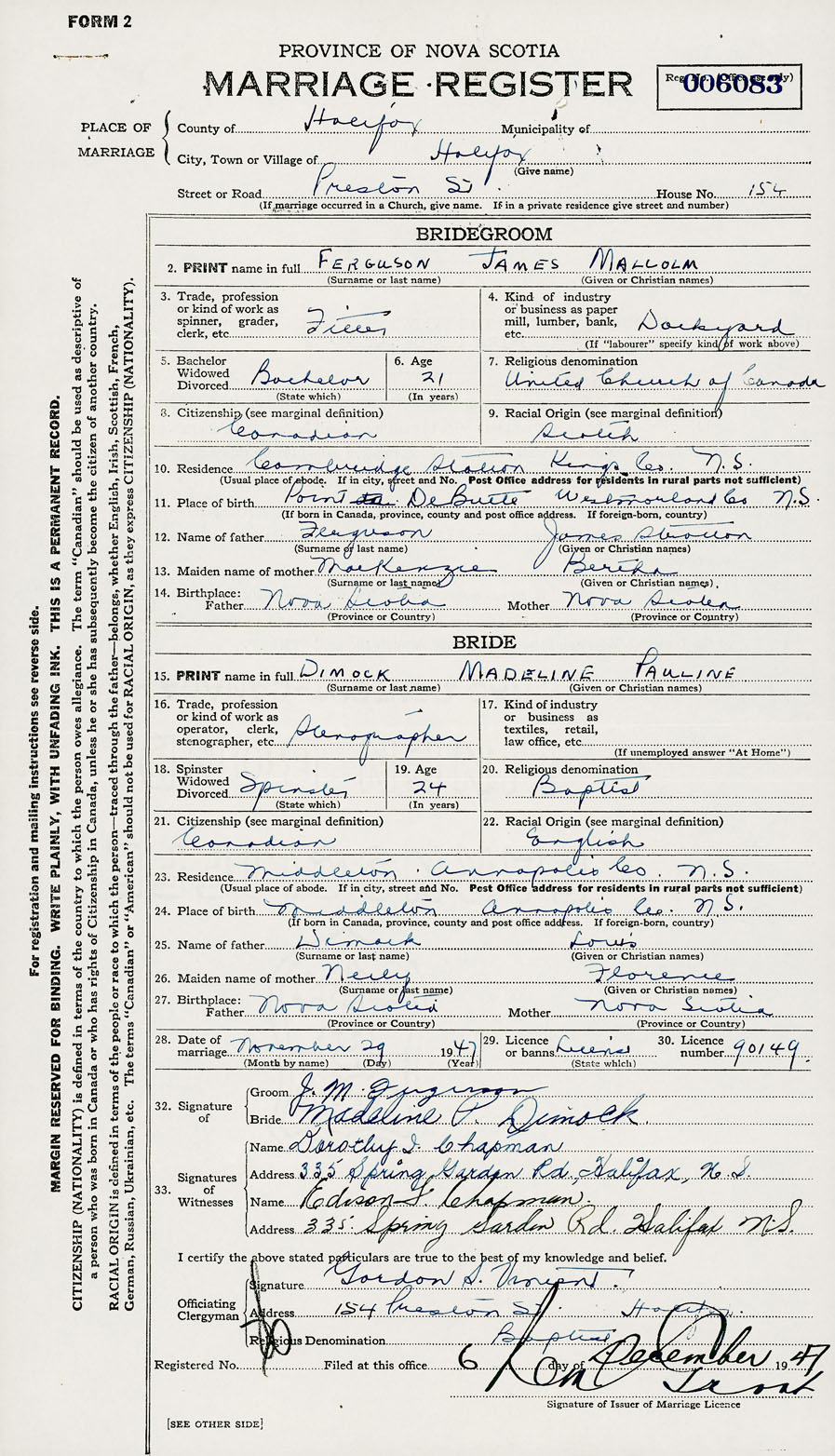 28. Date of marriage November 29 1947 29. By license or banns License 30. License number 90149