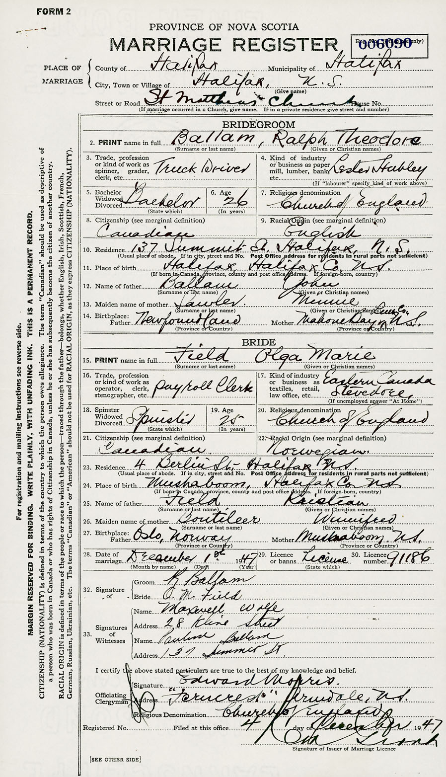 28. Date of marriage December 1 1947 29. By license or banns License 30. License number 91186