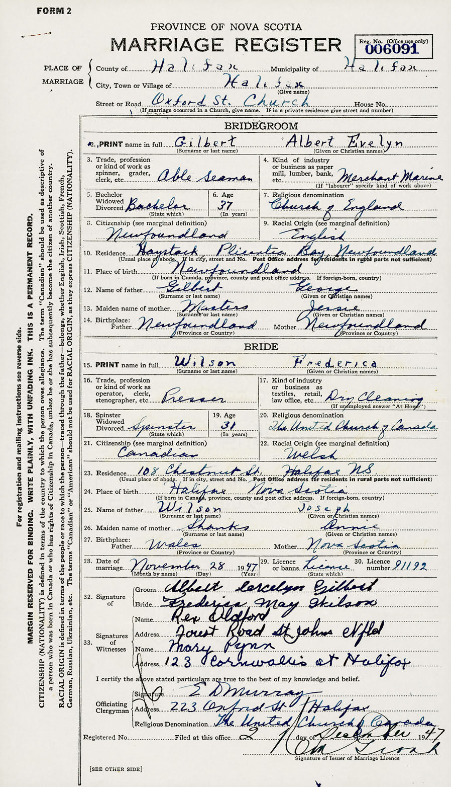 28. Date of marriage November 28 1947 29. By license or banns License 30. License number 91192