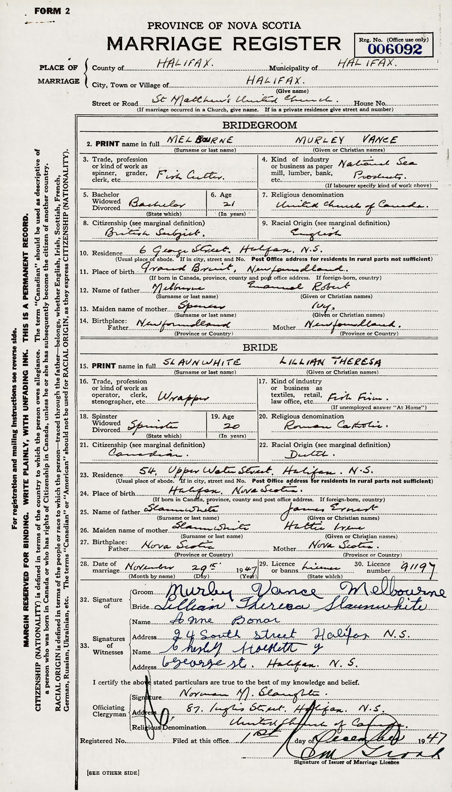 28. Date of marriage November 29 1947 29. By license or banns License 30. License number 91197