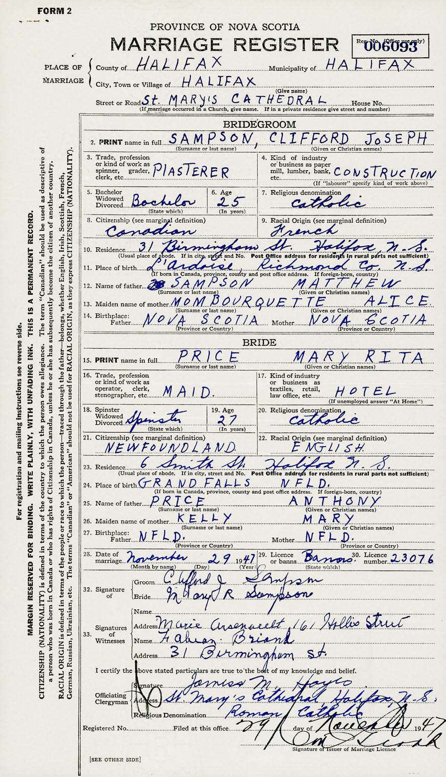 28. Date of marriage November 29 1947 29. By license or banns License 30. License number 23076