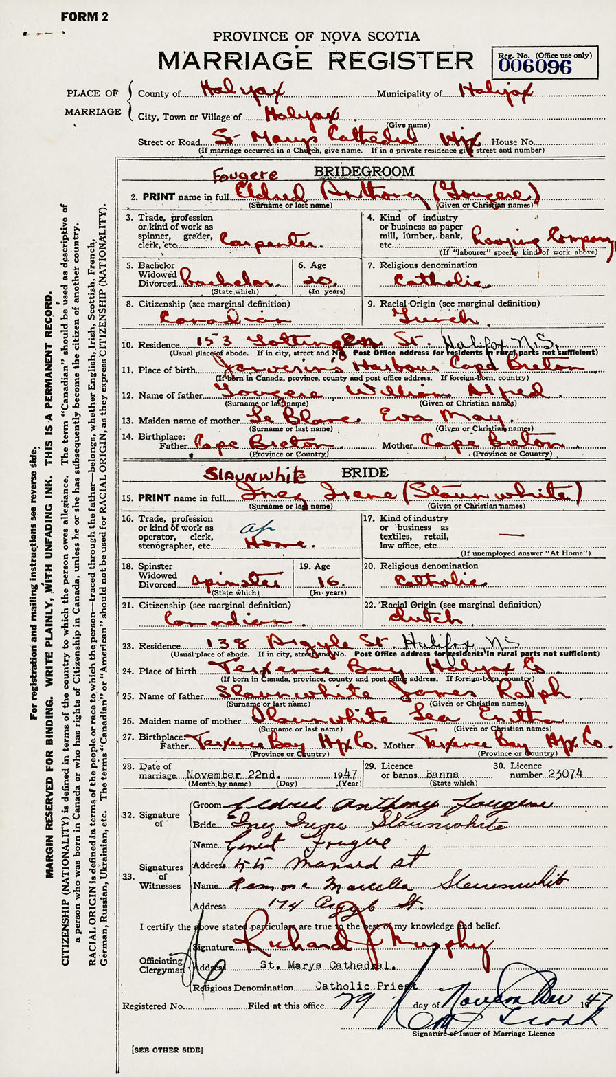 28. Date of marriage November 22 1947 29. By license or banns License 30. License number