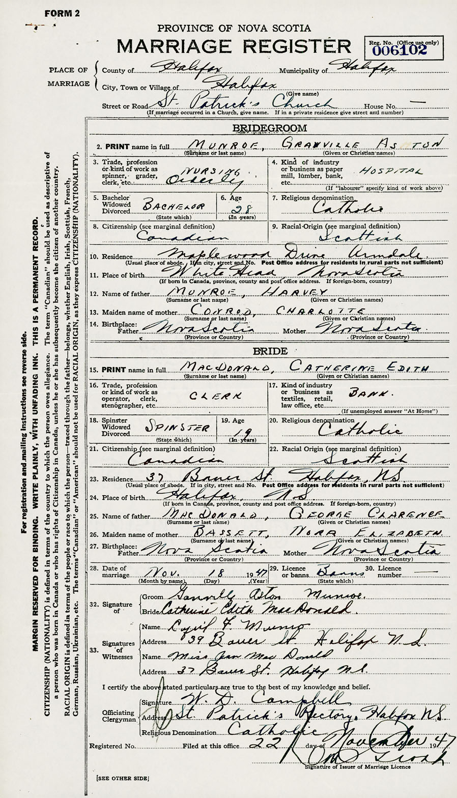 28. Date of marriage November 18 1947 29. By license or banns License 30. License number