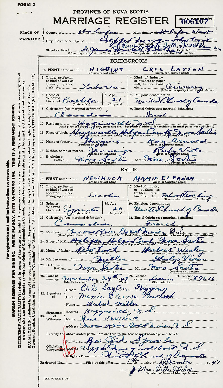 28. Date of marriage November 29 1947 29. By license or banns License 30. License number 89616