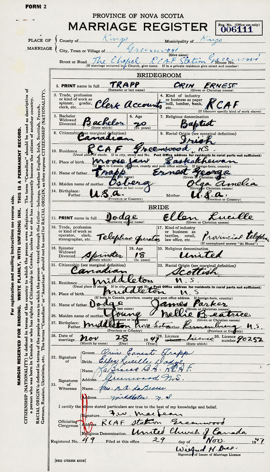 28. Date of marriage November 28 1947 29. By license or banns License 30. License number 90252