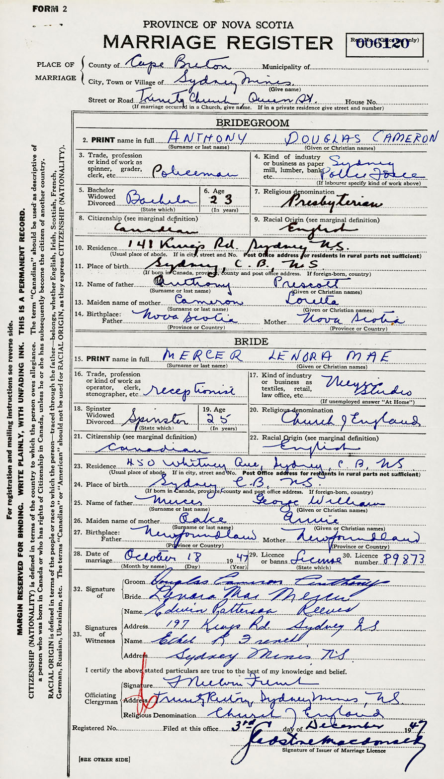 28. Date of marriage October 18 1947 29. By license or banns License 30. License number 89873